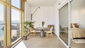 A unique investment on the entire Mediterranean coast there is no other building like the Residential Sky Resort. It is unique for many reasons. Due to its location next to the exclusive Poniente beach. For the uniqueness of its contemporary art deco architecture. For the quality and warmth of the materials used. For the original design of its interiors. For the views that are enjoyed in its 256 apartments. For the maximum privacy offered by the homes. Because of the high standard and the amount of community services that all homeowners have access to. For the variety and originality of its common areas. Each of the almost 200 meters high Residential Sky Resort is a unique, safe, unsurprising and full of satisfaction investment."