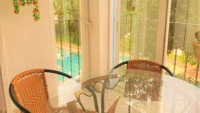 Apartmán má otvorenú vybavenú kuchyňu s obývačkou; 1 spálňu, kúpeľňu. Bonusom je romantická zimná záhrada s výhľadom na bazén využiteľná v lete aj v zime. K vybaveniu patria okrem nábytku; vstavané skrine, okná s dvojitým sklom s hliníkovými žalúziami. V cene ubytovania je parkovacie miesto priamo pred apartmánom.